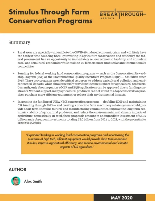 This policy briefing from US think tank The Breakthrough Institute lays out options for post-COVID-19 stimulus spending in the United States. It suggests funding farm conservation programmes that could improve farmer profitability, generate jobs, and improve environmental performance. It also proposes nationally scaling up farm machinery rebate systems, which exist in a few states, to encourage the purchase of efficient agricultural equipment.