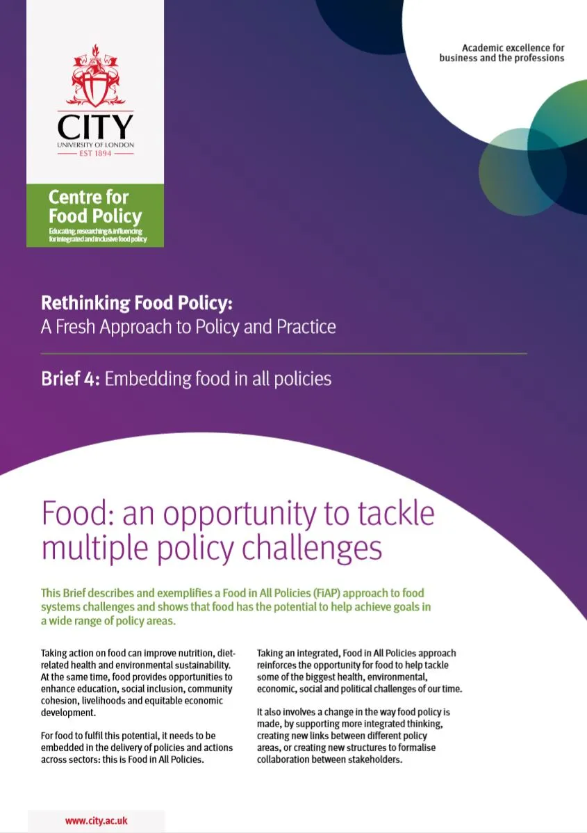 This report by the Centre for Food Policy at City, University of London sets out how a “Food in All Policies” approach to food systems challenges can meet goals not only relating to food but also relating to education, social inclusion, livelihoods and fair economic development.