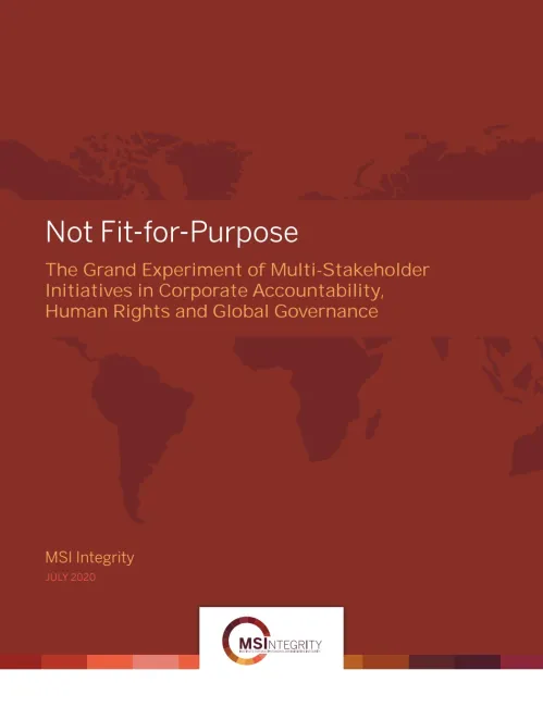 This report from the US nonprofit Institute for Multi-Stakeholder Initiative Integrity looks at 40 multi-stakeholder initiatives (MSIs) - voluntary standards set by civil society organisations and industry, such as Fairtrade International, the Roundtable on Sustainable Palm Oil and the Marine Stewardship Council - and concludes that MSIs are not effective at holding corporations accountable for abuses or protecting human rights.
