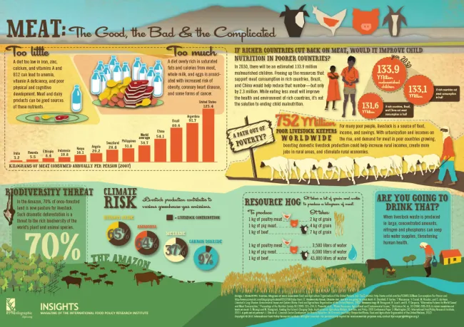 The International Food Policy Research Institute (IFPRI) recently produced an infographic on the food security implications of meat consumption, including health and nutrition, biodiversity and climate risks, and impact on poverty.