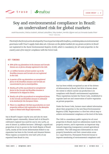 This brief from Trase (a partnership between the Stockholm Environment Institute and Global Canopy) examines soy grown on unregistered farms in Brazil. Legally, farms in Brazil should be registered with the Rural Environmental Registry as the first step of complying with the Forest Code, which stipulates how much native vegetation should be left intact on private properties.